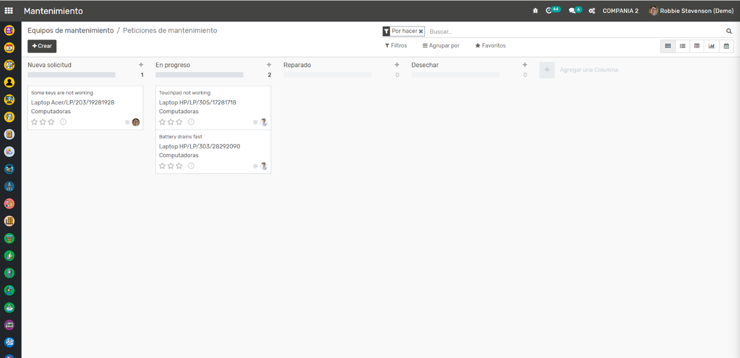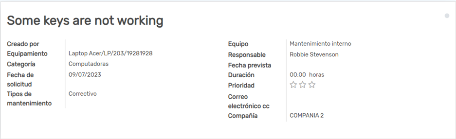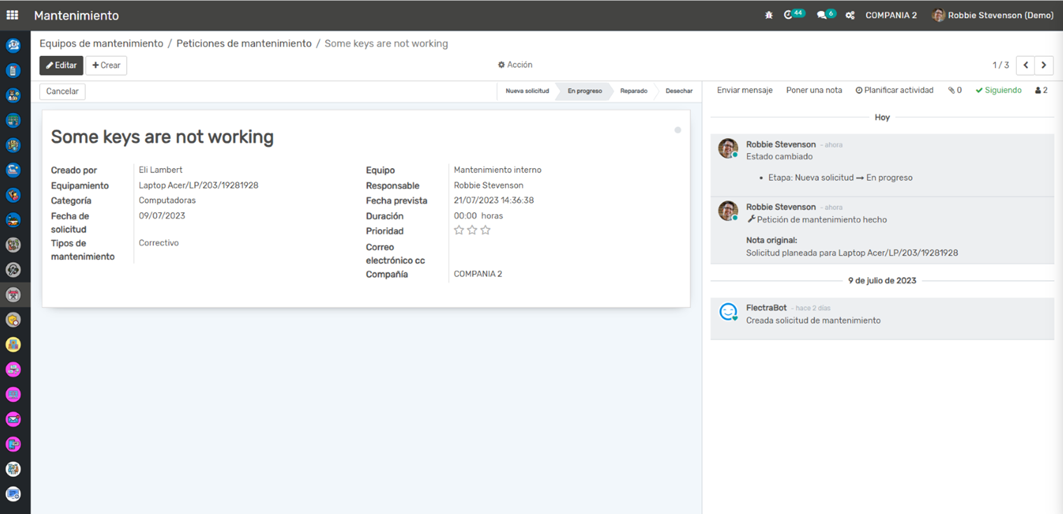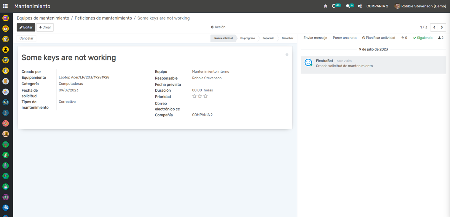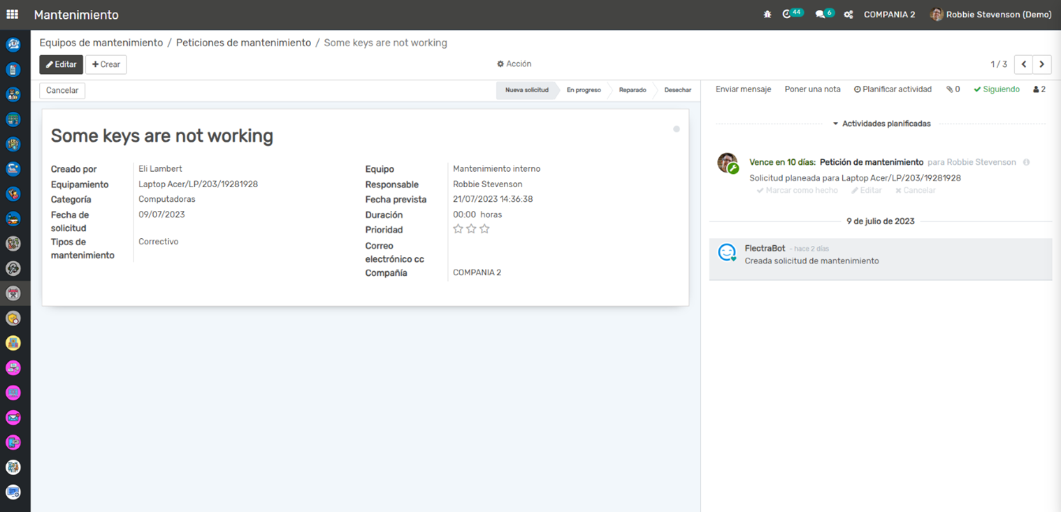 Solicitudes de mantenimiento: Los empleados pueden enviar solicitudes de mantenimiento cuando detectan problemas con el equipo. Esta función asegura que los problemas se resuelvan rápidamente, evitando demoras en las operaciones comerciales.