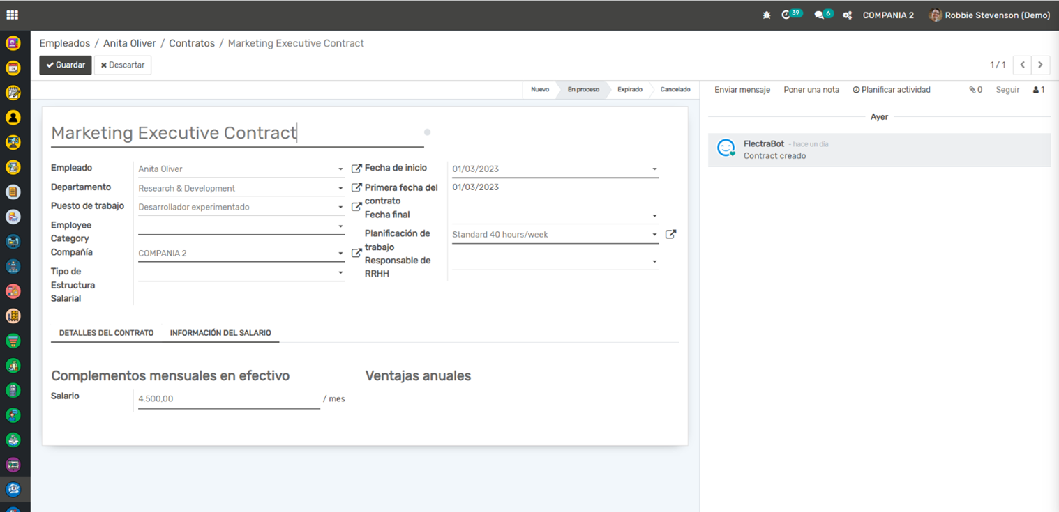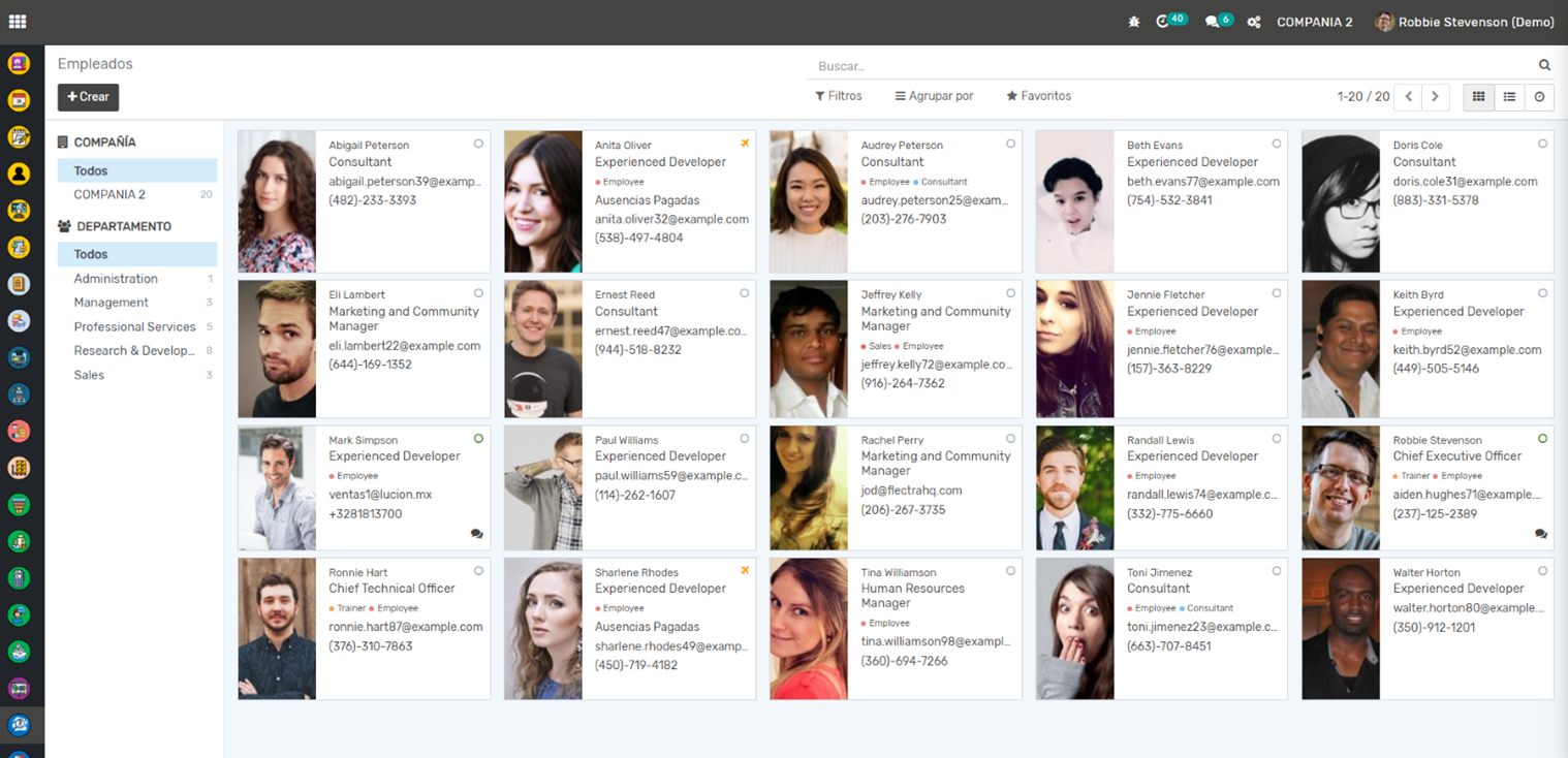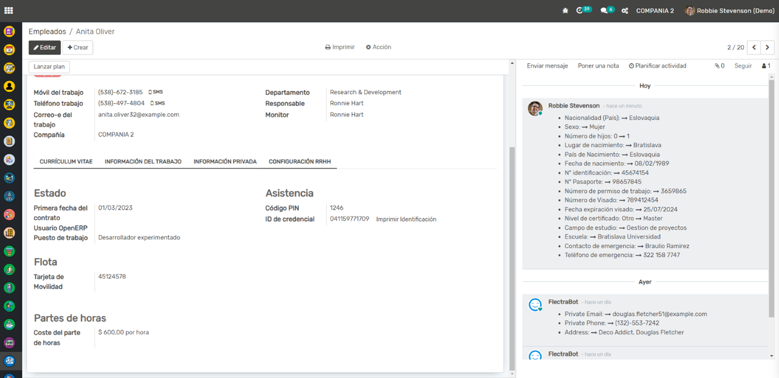Gestión de Empleados: Esta aplicación te permite mantener un registro detallado de todos tus empleados, incluyendo su información personal, detalles del contrato, posiciones, horarios de trabajo y más. También puedes seguir la evolución de cada empleado en la empresa (promociones, cambios de salario, etc.).