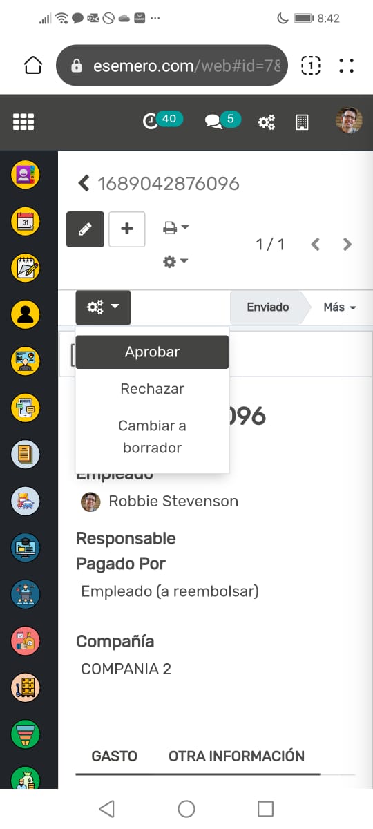 Validación de Gastos: Los gerentes pueden revisar y aprobar los informes de gastos de los empleados directamente desde la aplicación. La interfaz facilita la revisión de cada gasto y proporciona un mecanismo sencillo para aprobar o rechazar gastos.
