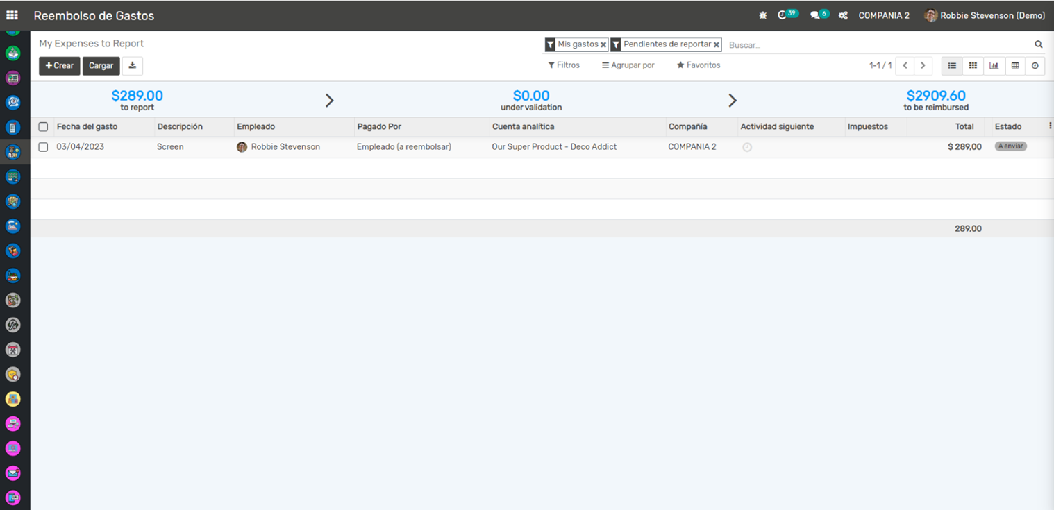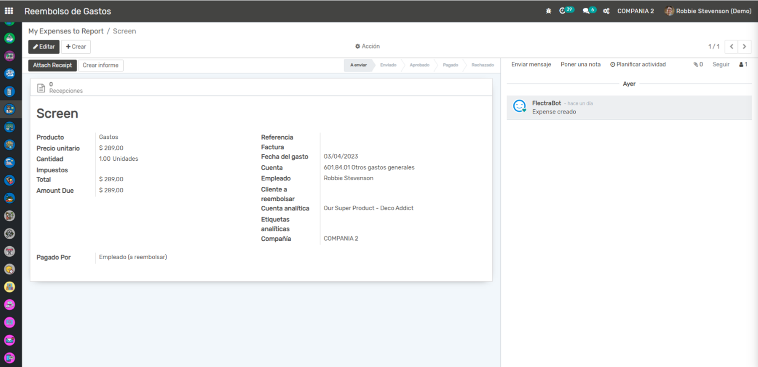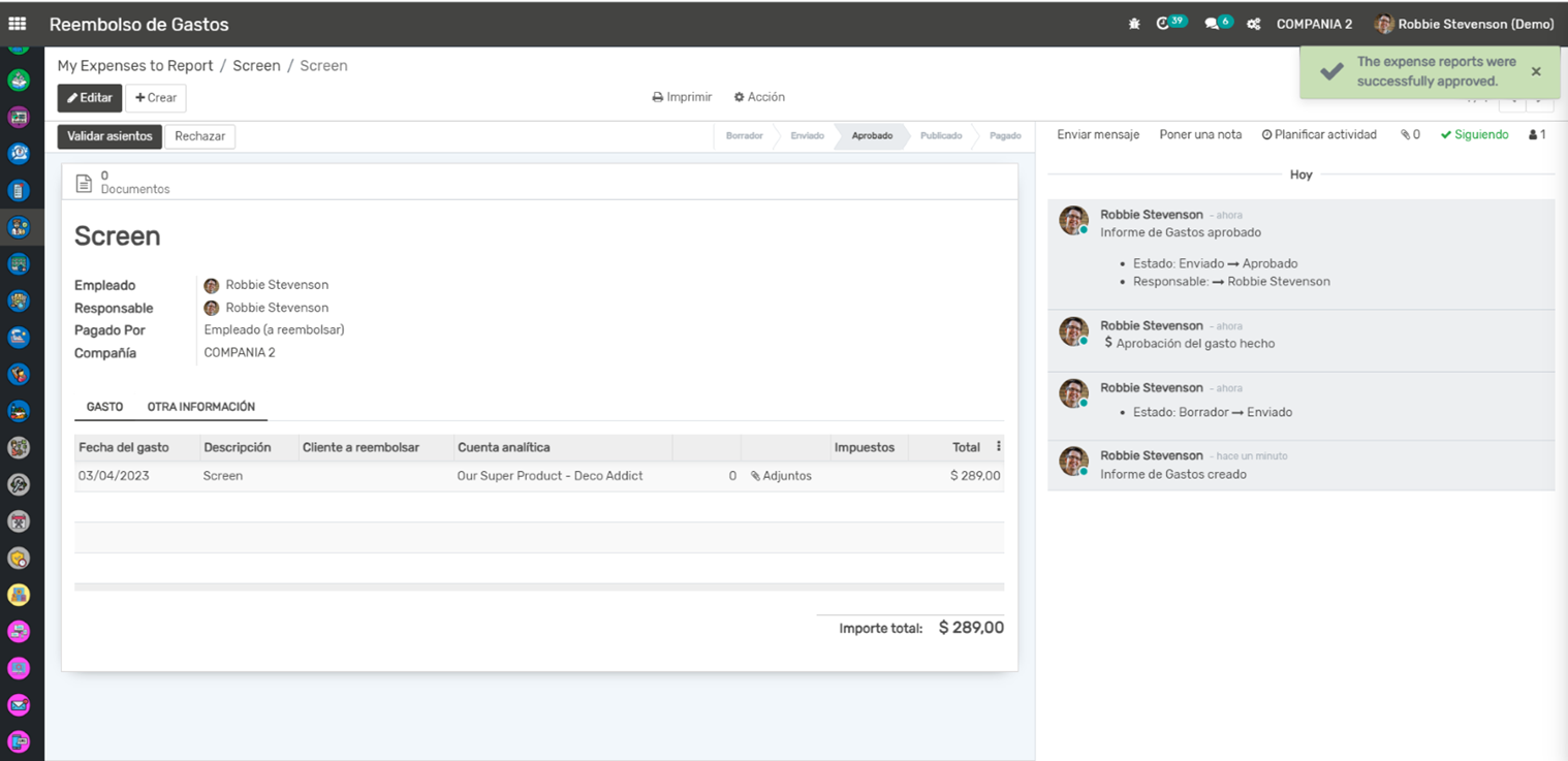 Reembolso de Gastos: Una vez que un informe de gastos es aprobado, se crea automáticamente una factura de proveedor para el reembolso del empleado. Esto facilita el seguimiento del reembolso y garantiza que los empleados sean reembolsados de manera oportuna.