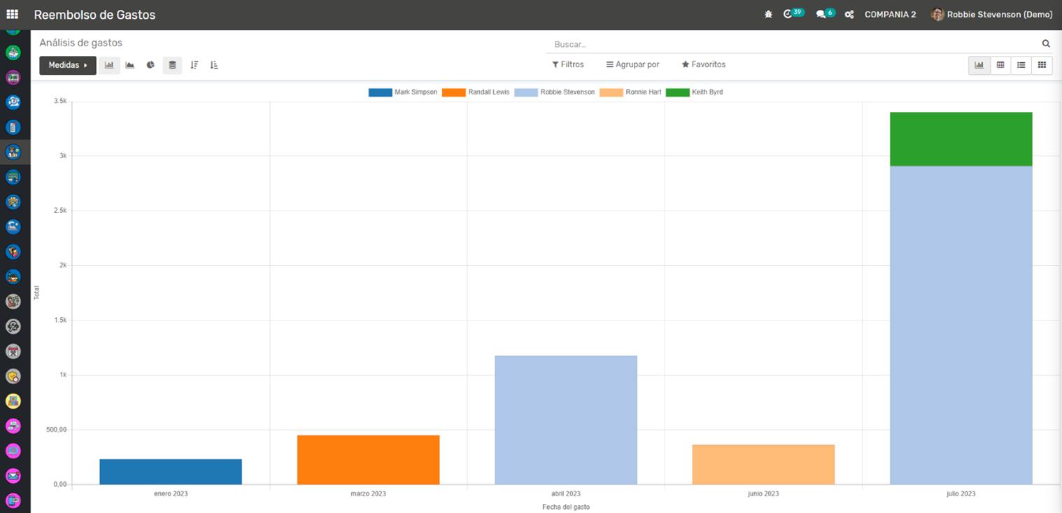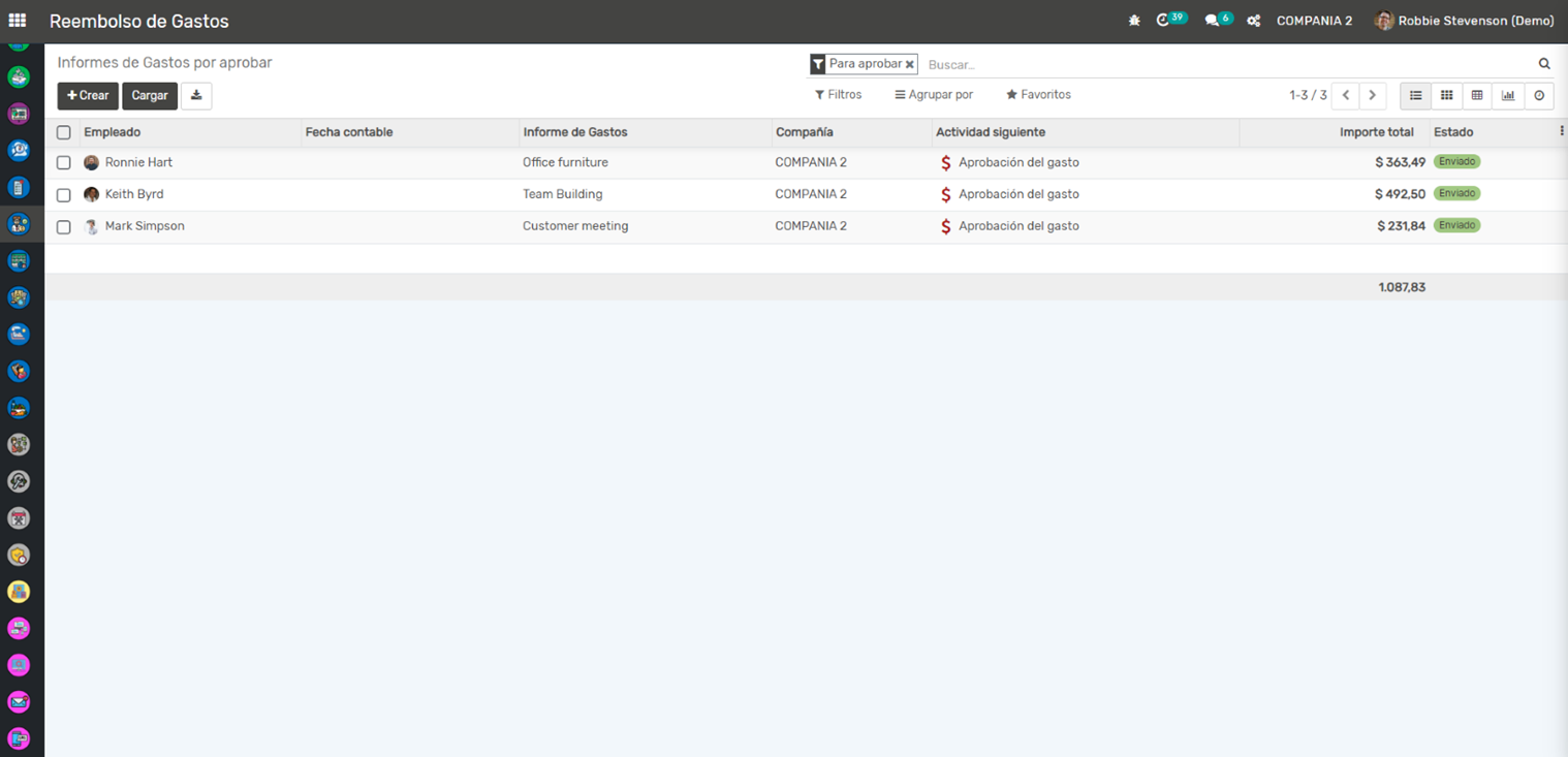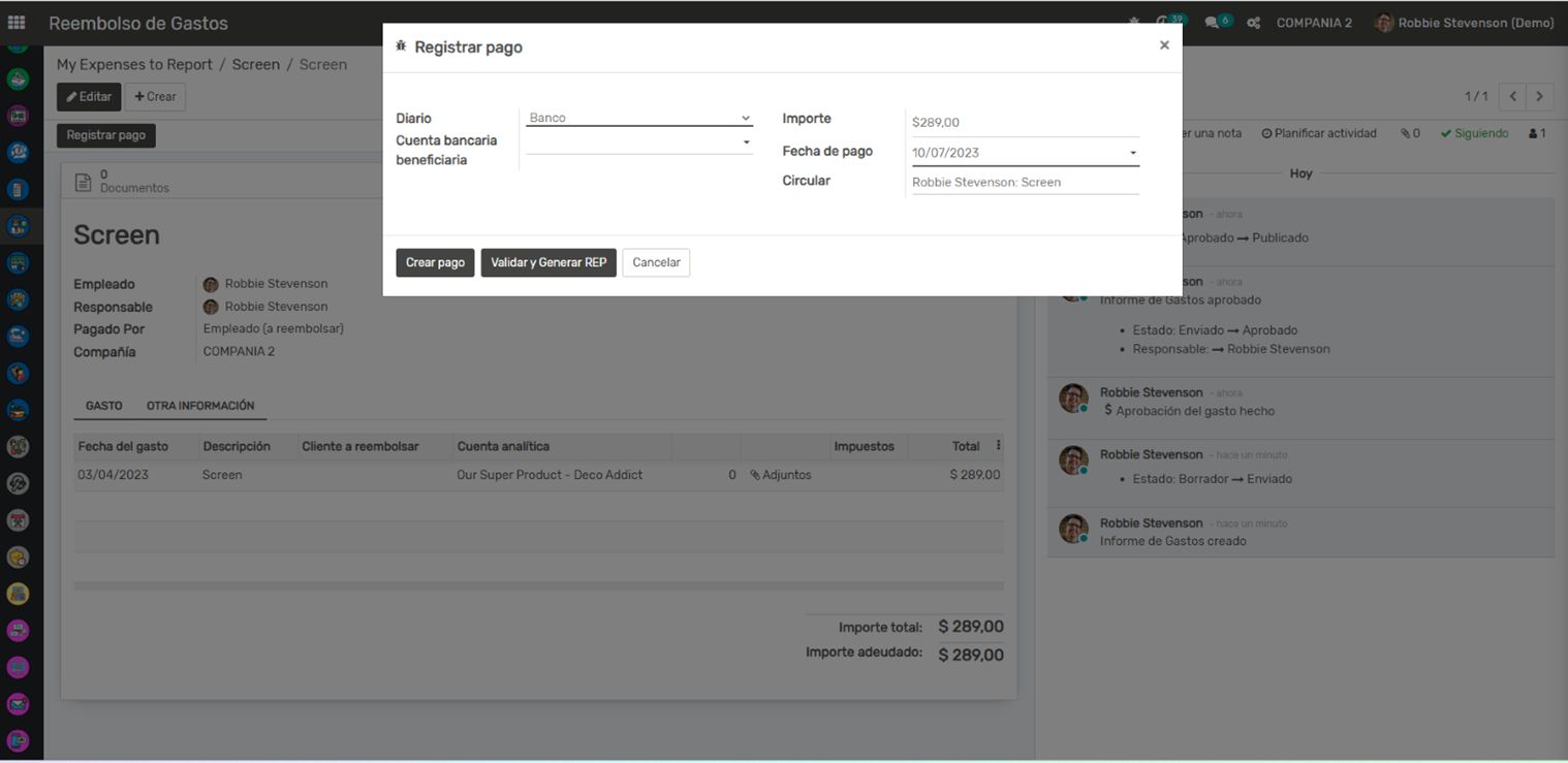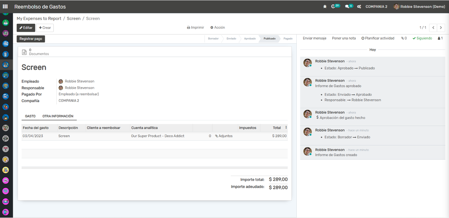 Reembolso de Gastos: Una vez que un informe de gastos es aprobado, se crea automáticamente una factura de proveedor para el reembolso del empleado. Esto facilita el seguimiento del reembolso y garantiza que los empleados sean reembolsados de manera oportuna.