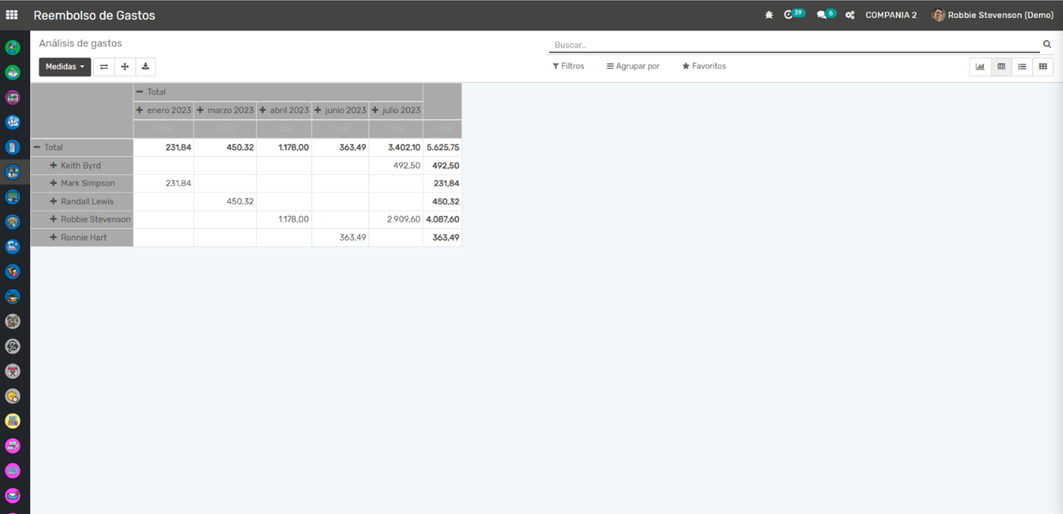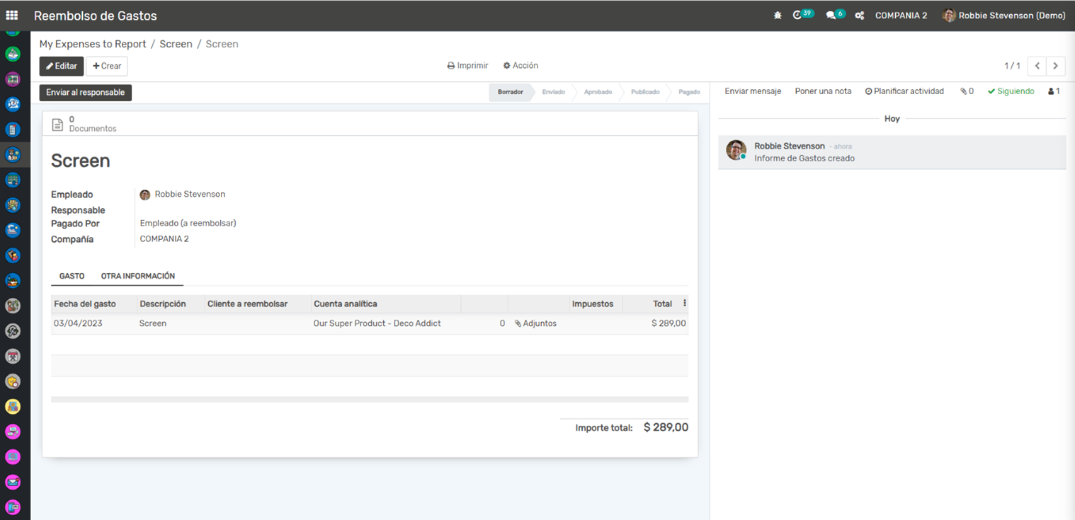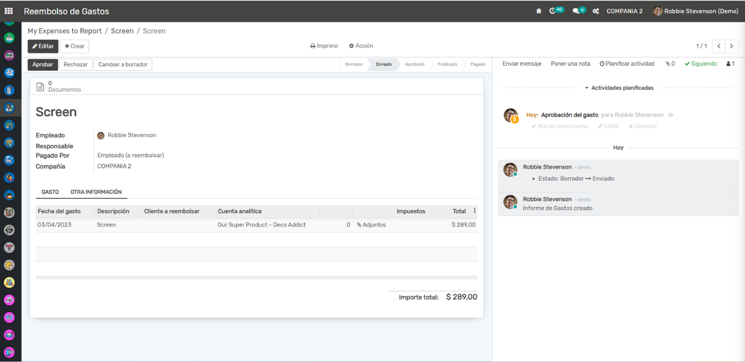 Presentación de Informes de Gastos: Los empleados pueden agrupar gastos relacionados en informes de gastos, que luego pueden enviarse para su aprobación.
