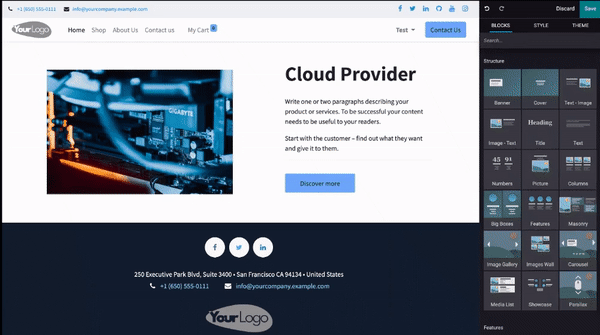 • Constructor de Sitios Web Esta función permite a los usuarios construir y personalizar su sitio web arrastrando y soltando bloques, sin necesidad de tener conocimientos técnicos avanzados.