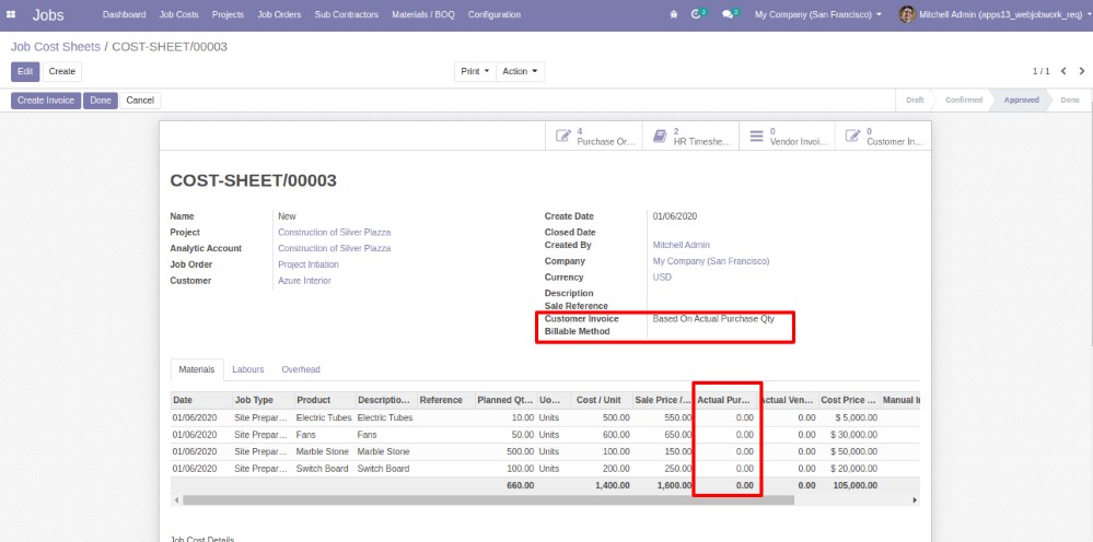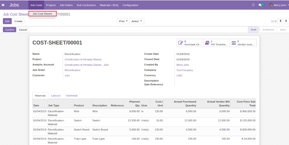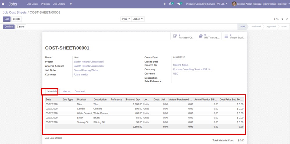 Permita que su equipo de proyecto/gerente de proyecto configure/establezca Costos de materiales, Costos de mano de obra y Costos generales en la Hoja de costos del trabajo donde el equipo del proyecto puede planificar sus diferentes trabajos del Proyecto.