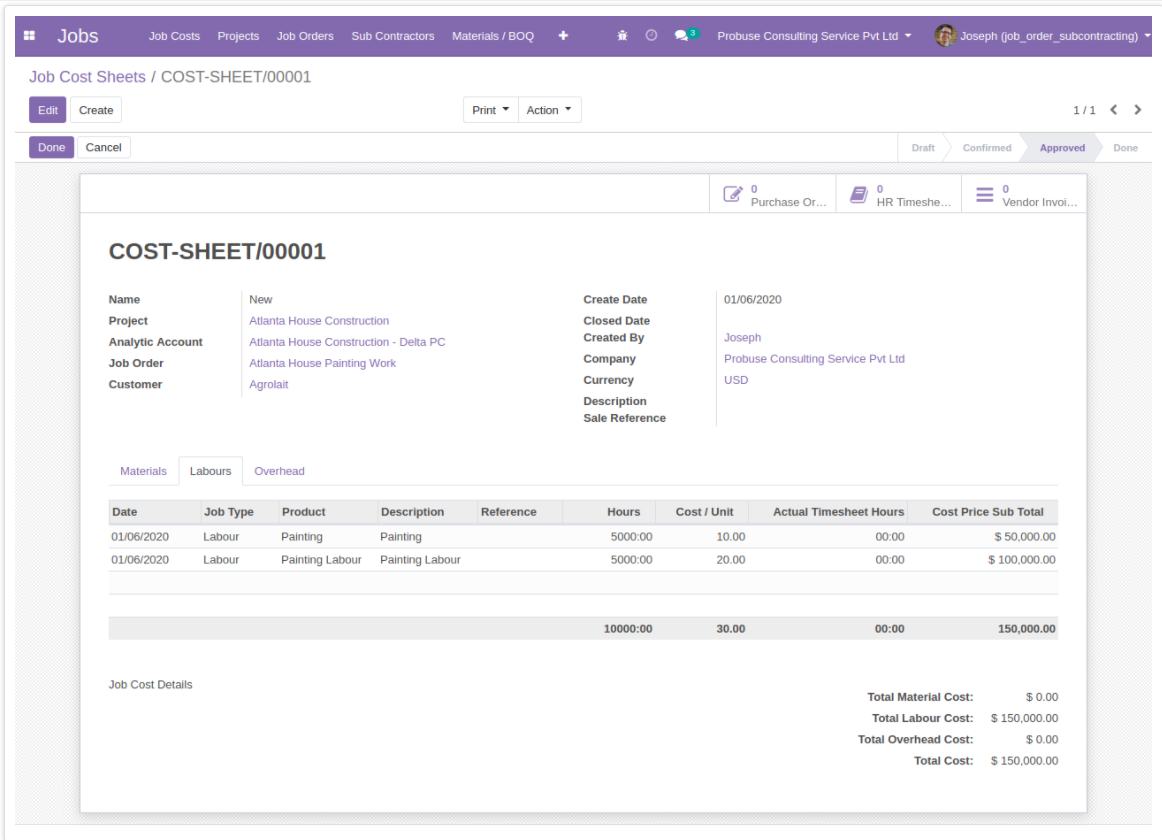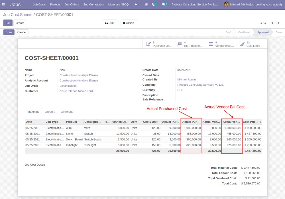 Esta aplicación le permite ver el costo real de la orden de compra, el costo real de la factura del proveedor y el costo real de la hoja de horas/mano de obra en el formulario Hoja de costos de trabajo para proyectos de construcción y contratación de trabajo y órdenes de trabajo/órdenes de trabajo.