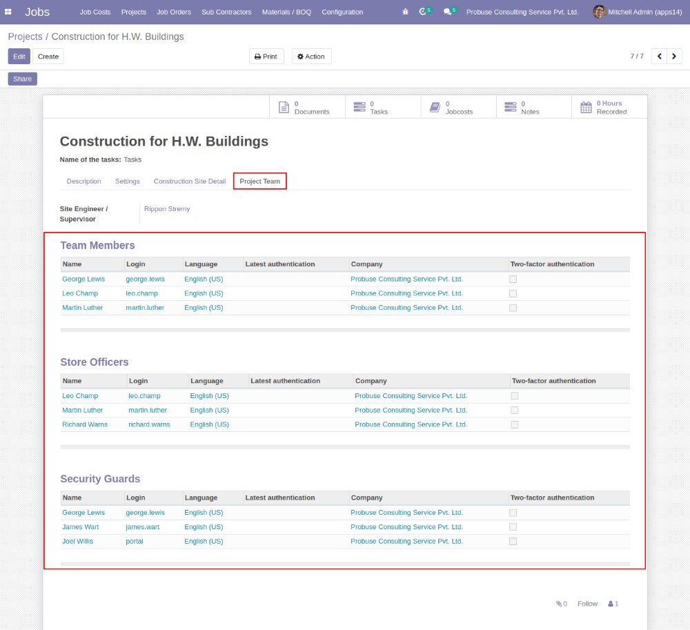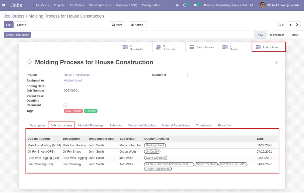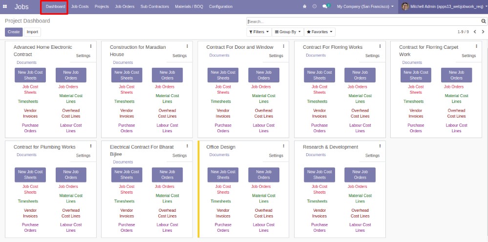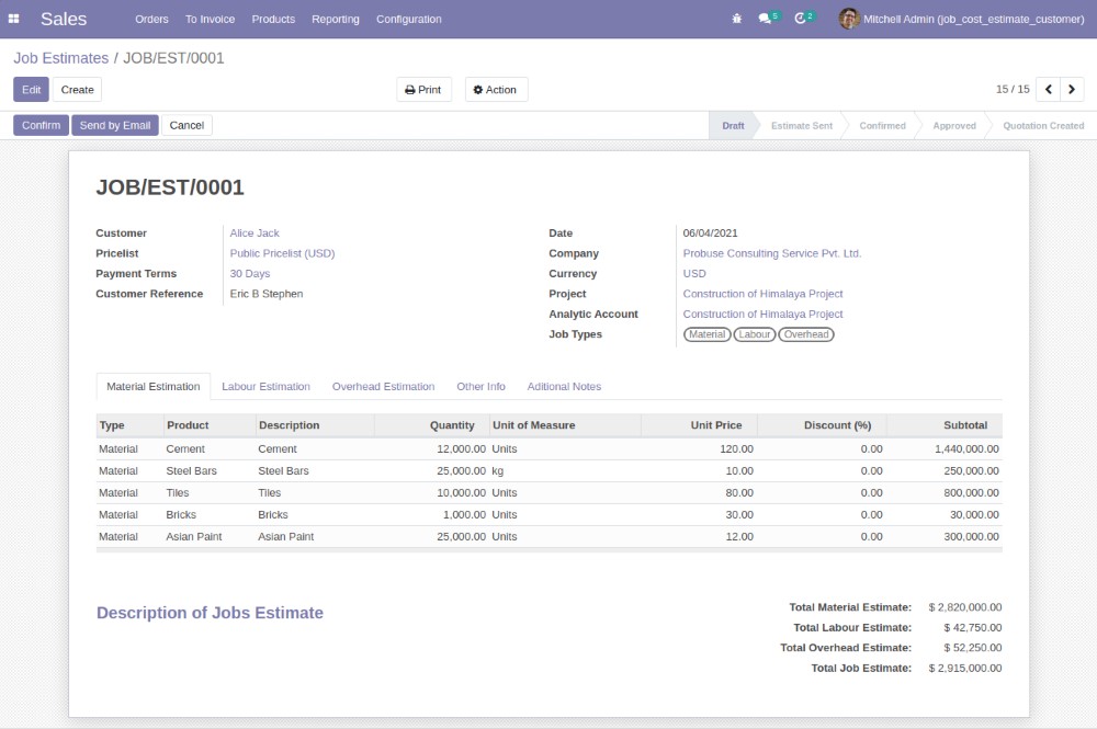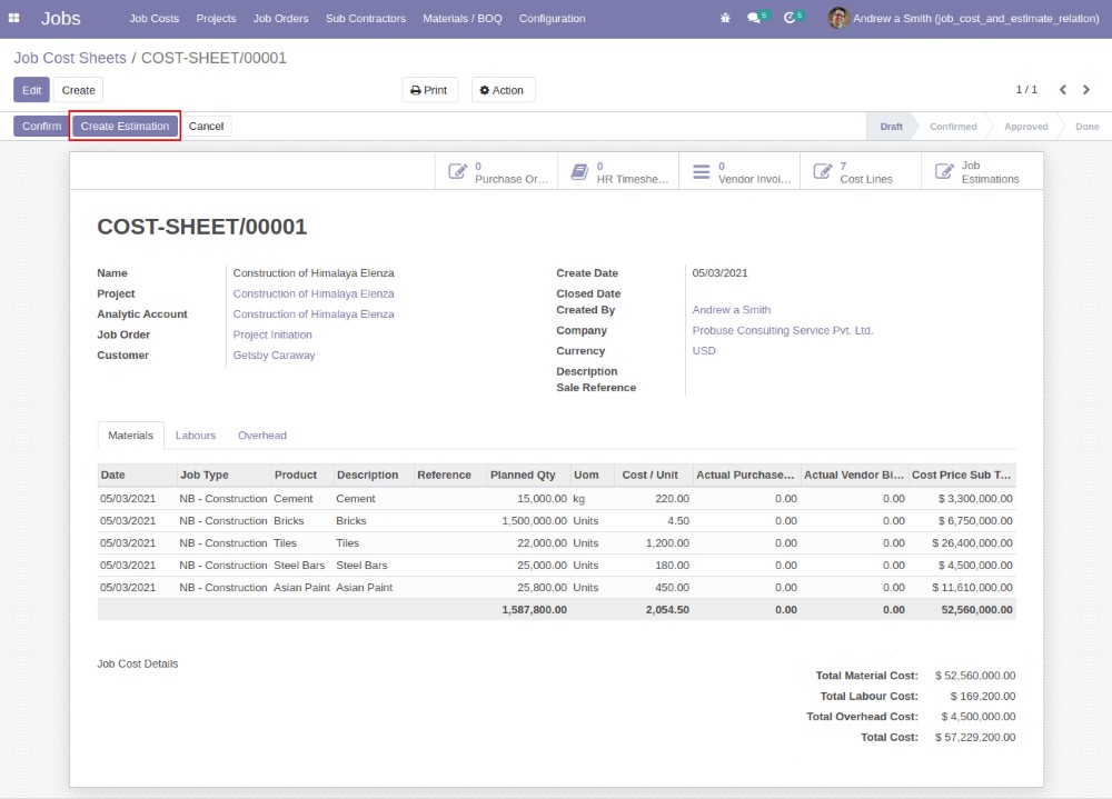 Esta aplicación le permite administrar cualquier tipo de Proyecto(s)/Contrato(s) utilizando sus funciones de cálculo de costos de trabajo (contratación) y hojas de costos de trabajo. Básicamente, le permite preparar una hoja de costos de trabajo y costos de trabajo para planificar su costo de materiales, mano de obra y gastos generales para su proyecto. Esta aplicación también le permite tener un negocio de administración de construcción en Odoo, lo que le permite administrar proyectos relacionados con sus construcciones en Odoo. Puede planificar el costo del material, el costo de la mano de obra y los costos generales en la hoja de costos del trabajo. También puede brindarle el costo real basado en su orden de compra, hojas de tiempo y facturas de proveedores para que pueda ver cuáles fueron los costos de planificación y cuál es su costo real de mano de obra, material y gastos generales relacionados con su proyecto y orden de trabajo/órdenes de trabajo.