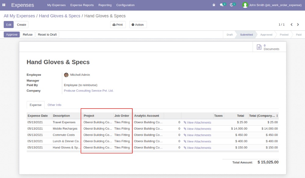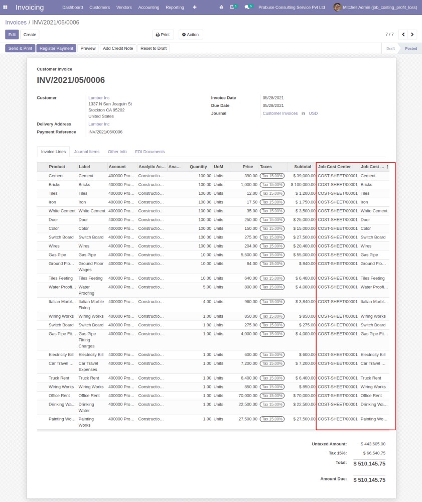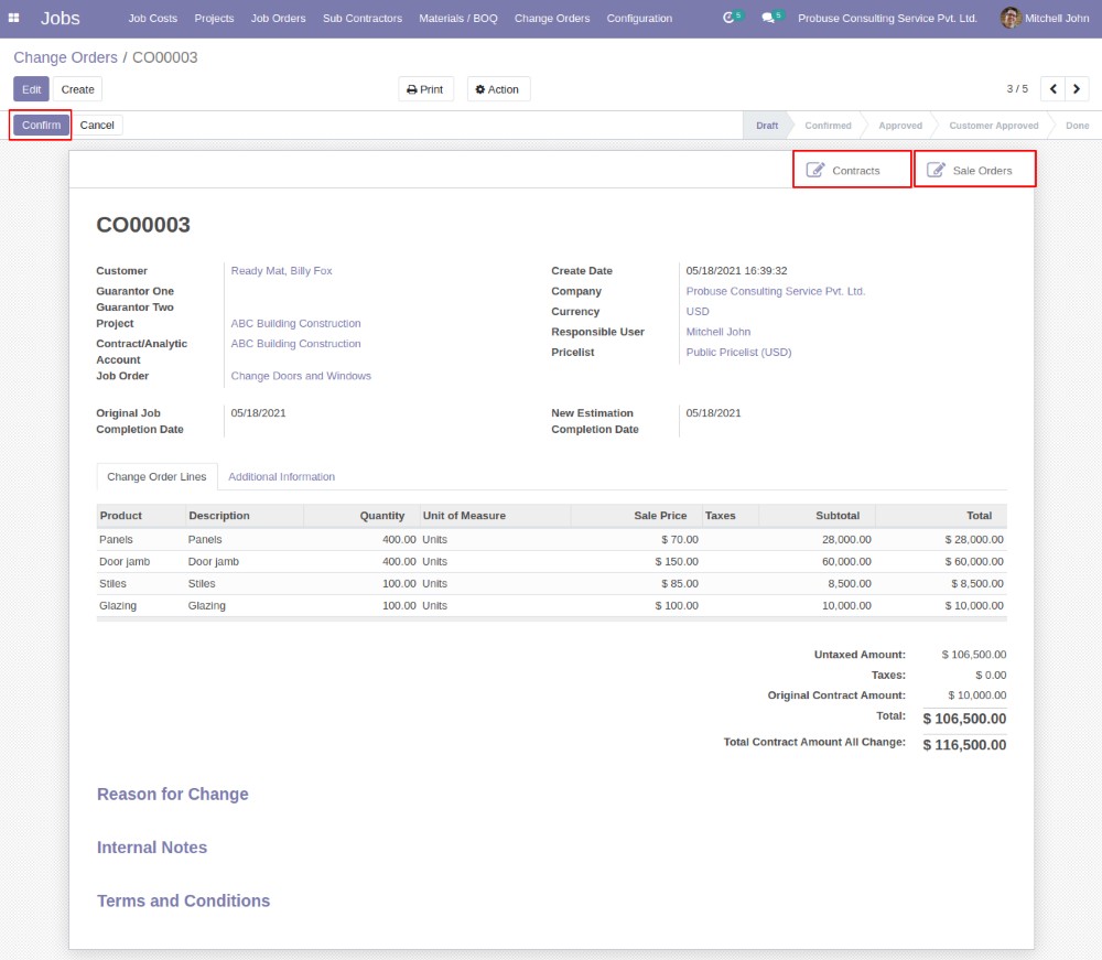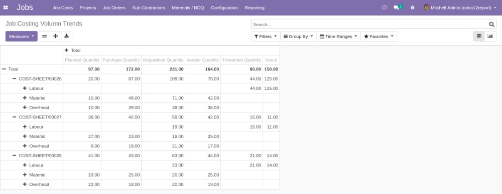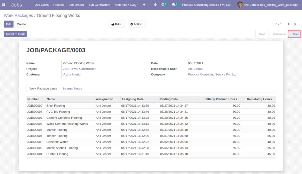 Esta aplicación le permite administrar cualquier tipo de Proyecto(s)/Contrato(s) utilizando sus funciones de cálculo de costos de trabajo (contratación) y hojas de costos de trabajo. Básicamente, le permite preparar una hoja de costos de trabajo y costos de trabajo para planificar su costo de materiales, mano de obra y gastos generales para su proyecto. Esta aplicación también le permite tener un negocio de administración de construcción en Odoo, lo que le permite administrar proyectos relacionados con sus construcciones en Odoo. Puede planificar el costo del material, el costo de la mano de obra y los costos generales en la hoja de costos del trabajo. También puede brindarle el costo real basado en su orden de compra, hojas de tiempo y facturas de proveedores para que pueda ver cuáles fueron los costos de planificación y cuál es su costo real de mano de obra, material y gastos generales relacionados con su proyecto y orden de trabajo/órdenes de trabajo.