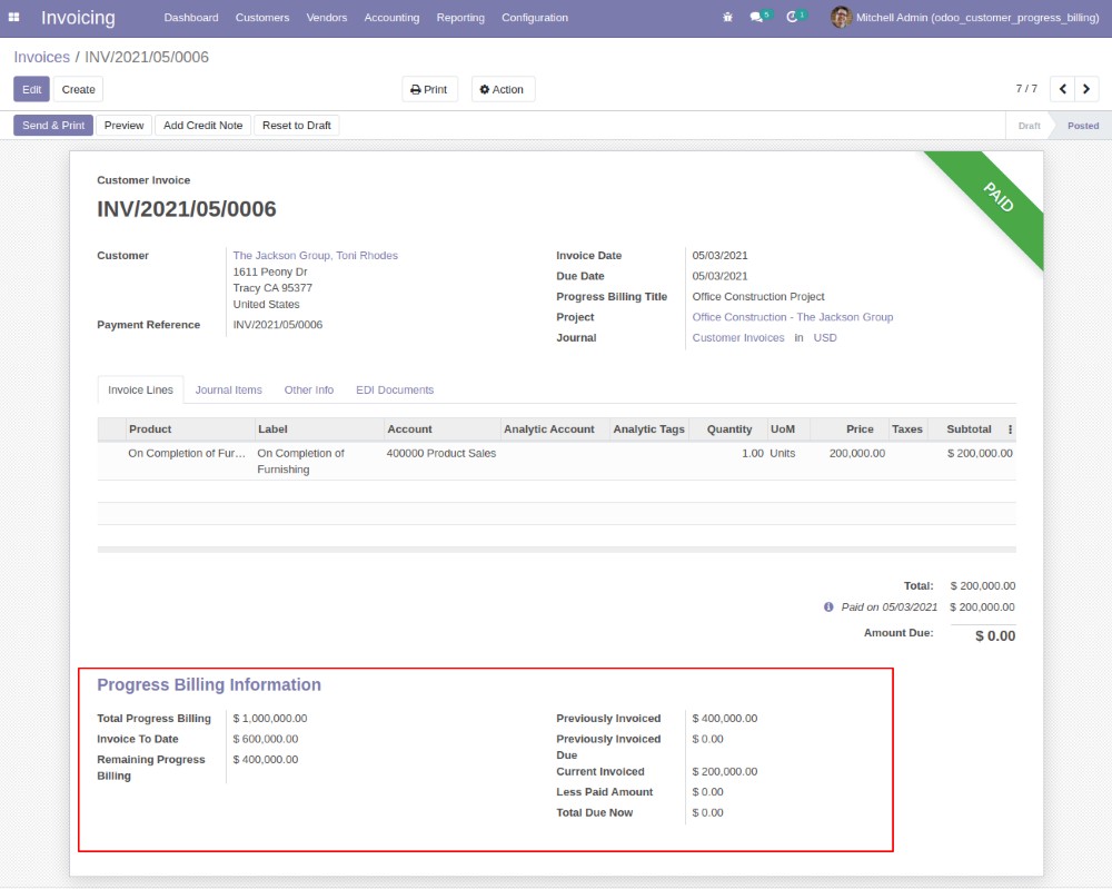 Este módulo permite a sus usuarios de contabilidad crear facturación de progreso y permitirles imprimir la facturación de progreso en formato PDF como se muestra en las capturas de pantalla a continuación.