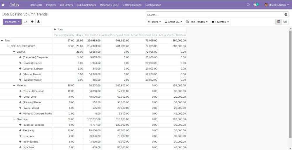 Brinda una idea completa sobre su costo planificado y el costo real, ya que el sistema le permite configurar una cantidad planificada para material, mano de obra, gastos generales en la hoja de costos del trabajo y, al mismo tiempo, mostrar automáticamente las cantidades reales en la hoja de costos. Esta cantidad real se basa en la vinculación de la orden de compra, las facturas de los proveedores y las hojas de tiempo, donde el sistema le permite seleccionar el centro de costos del trabajo y la línea de costo en la orden de compra, las facturas del proveedor y las hojas de tiempo.