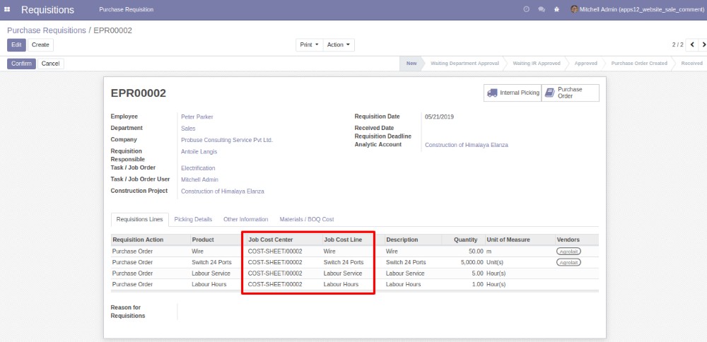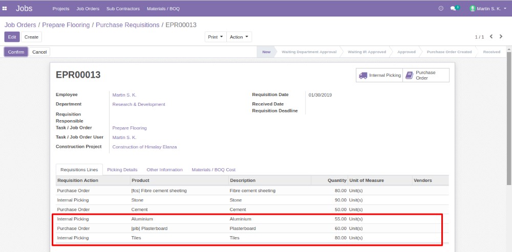 Requisición de materiales / solicitud y gestión de BOQ. Esto también permite crear órdenes de compra sobre la marcha y Picking Interno / Transferencia Interna desde Solicitud de Materiales / BOQ.