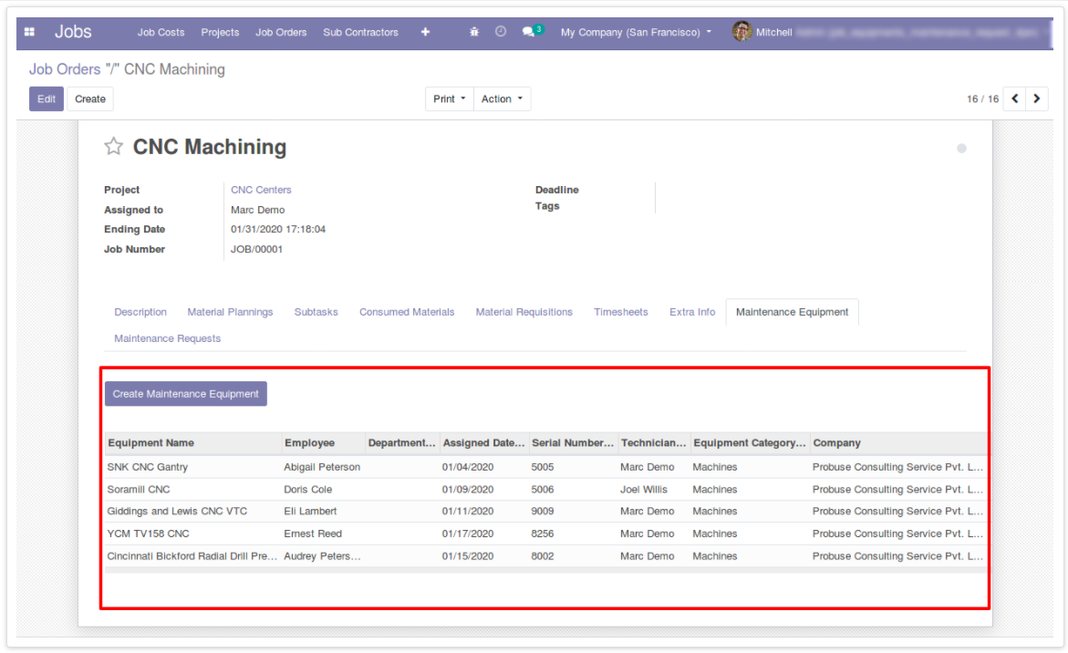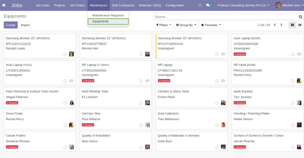 Este módulo agregará los menús estándar de mantenimiento y equipo de Odoo en el menú *Trabajo* y vinculará la solicitud de mantenimiento del equipo con la orden de trabajo y el proyecto.