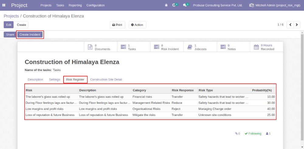 Esta aplicación permite que los usuarios del equipo del proyecto y los administradores del proyecto tengan funciones para administrar el riesgo en proyectos y tareas del proyecto, incluida la creación de incidentes de riesgo del proyecto y tareas para proyectos de construcción y contratación.