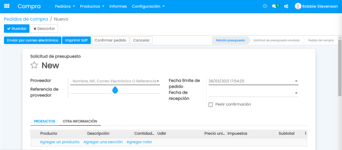 Mantenga un registro del inventario. Genere RFQ automáticamente cuando las acciones alcancen límites predefinidos. Envíe las órdenes de compra automáticamente según las normas de adquisición y las cotizaciones recibidas. Automatice el proceso de adquisición de proveedores autorizados.